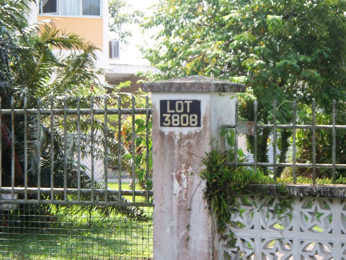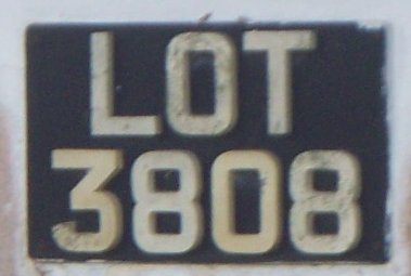 Here is another one. White on black, a one-line plate this time, number LOT 2323. ![]() Is this one a vehicle registration plate or is it another property marker? * ~ * ~ * ~ * The photo below shows the plate's real use. ![]() As with the previous "LOT" plate, it is an address marker for a piece of property in Brunei. Imagine what someone might think the smaller 2323 plate was if it showed up at a swap meet. Wow! A foreign motorcycle plate, with a neat number too!! But nope, that isn't what it is. Photo taken September 2011 in Kuala Belait, Brunei |